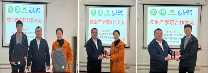 首先,在举行的简短欢迎仪式上,杜道林院长代表学院分别为其颁发了江苏大学和环境生态研究所的校友文创纪念品,对两位校友目前事业上取得的成功表示了肯定与衷心的祝贺,同时对他们回母校洽谈合作表示了热烈欢迎!
